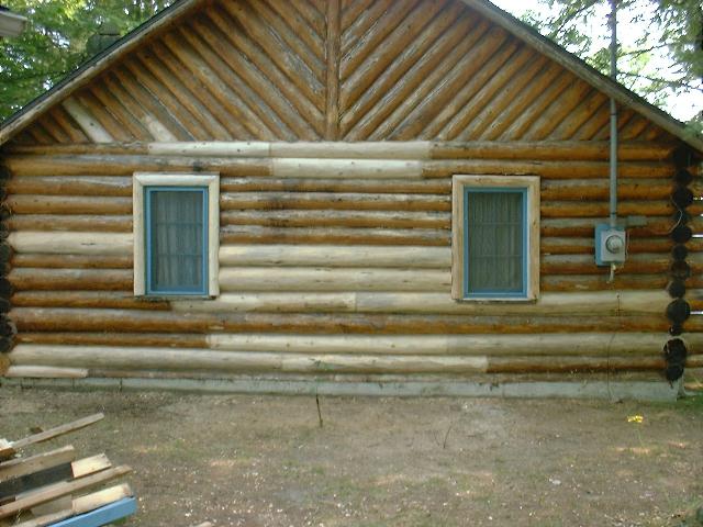 T he picture below is of a cabin we restored. The owners wanted to take out two windows in the front of the house that viewed into the front porch. As you can now see below, you can't tell where the windows once were. Since there was an uneven size in the logs on each side of the window, we replaced them all the way from the wall to the door. The color of the cabin before restoration can be seen on the garage in the background.