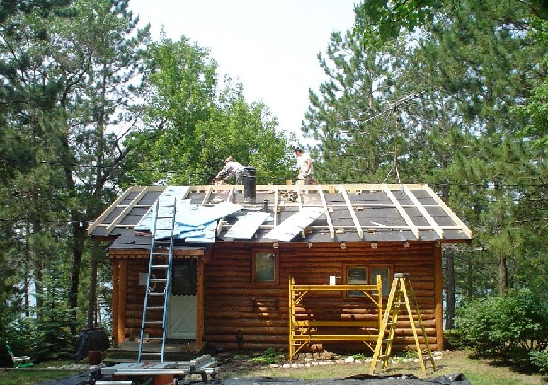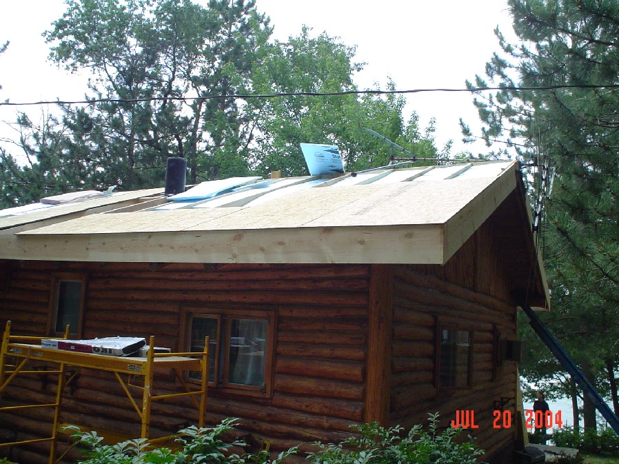 This job was a restoration and cold-roof job. The roof had a sway of over 8 inches in the middle from a previous owner cutting a rafter in half to install a stovepipe. we also found the roof was severely out of square. We built what is called a cold roof which is a 2x6 framework over the existing roof, insulated for better heating and then shingled. This type of roof is also good for new construction with cathedral ceilings because it lets you have the looks of the open ceiling with the insulation of a standard roof. Due to the roof being weakened by the cutting of the rafter, we didn't want to add the extra weight to the roof without bracing it. From inside the house, we added Perlin (the logs running the length of the roof) and several braces up from the tie poles (the logs that run side to side at the base of the roof). The added supports raised the middle of the roof a couple of inches and will prevent the roof from sagging in the future.
