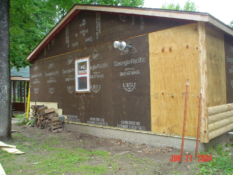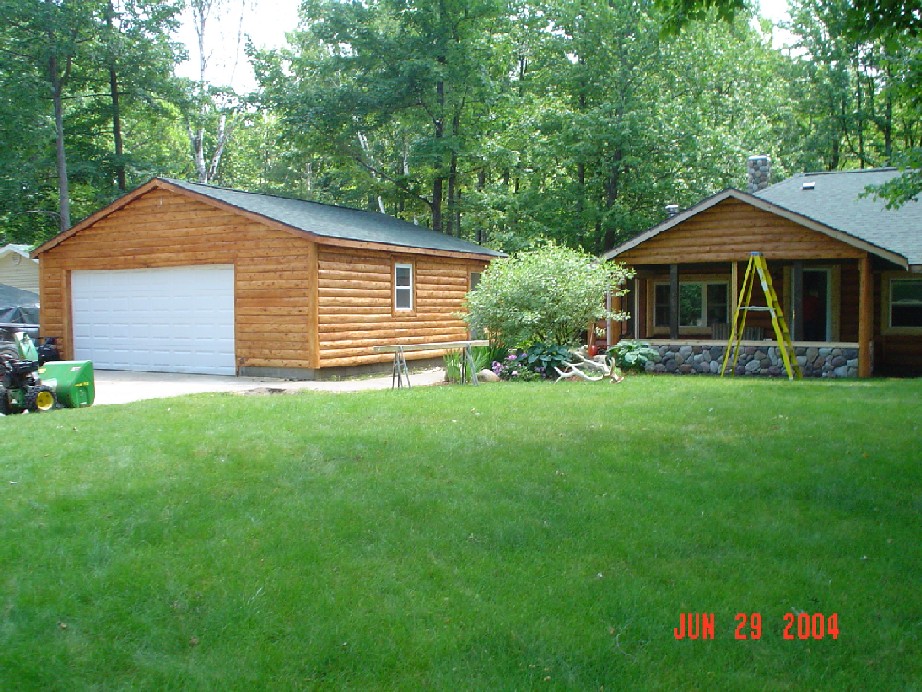 Below is a garage that we sided in Gaylord. This garage was originally covered in yellow aluminum siding that can be seen behind the firewood in the picture on the left, but that was removed and we covered it back with our 2" siding. Once we did this the garage blended in better with the house.